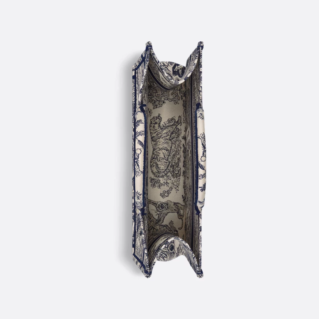 DIE DIOR BOOK TOTE LARGE „TOILE DE JOUY REVERSE“ – PREMIUM QUALITÄT – IST EIN ELEGANTES STATEMENT-PIECE, DAS HANDWERKLICHE PRÄZISION MIT IKONISCHEM DESIGN VEREINT. HERGESTELLT AUS ROBUSTEM, VOLLSTÄNDIG BESTICKTEM CANVAS, BESTICHT SIE DURCH DAS INVERTIERTE TOILE DE JOUY-MUSTER IN BLAU UND ECRU SOWIE DEN EINGESTICKTEN „CHRISTIAN DIOR PARIS“-SCHRIFTZUG – PERFEKT FÜR ALLTAG, REISEN ODER BESONDERE ANLÄSSE.